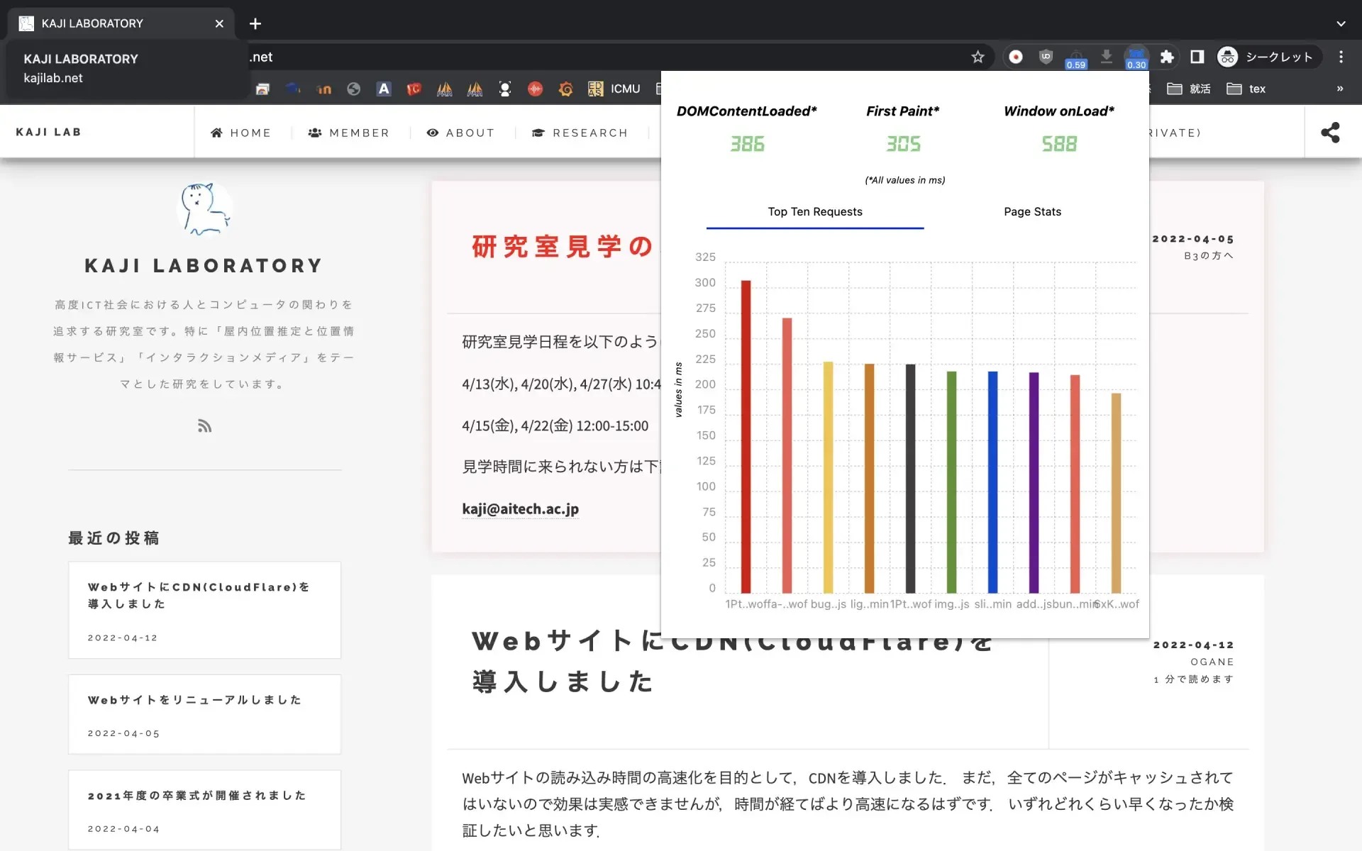 CDNを導入し,リソース読み込みの最適化を行なった結果,約0.5秒でロードが完了するようになりました. 導入前と比較して約1.7秒も短縮できたのでCDNの効果は絶大ですね.ちなみに,ロード時間が早くなった結果SEO対策にもなったらしく,Googleで「梶研究室」と検索した際の掲載順位が2位に上がっていました. (以前は3位でした.)