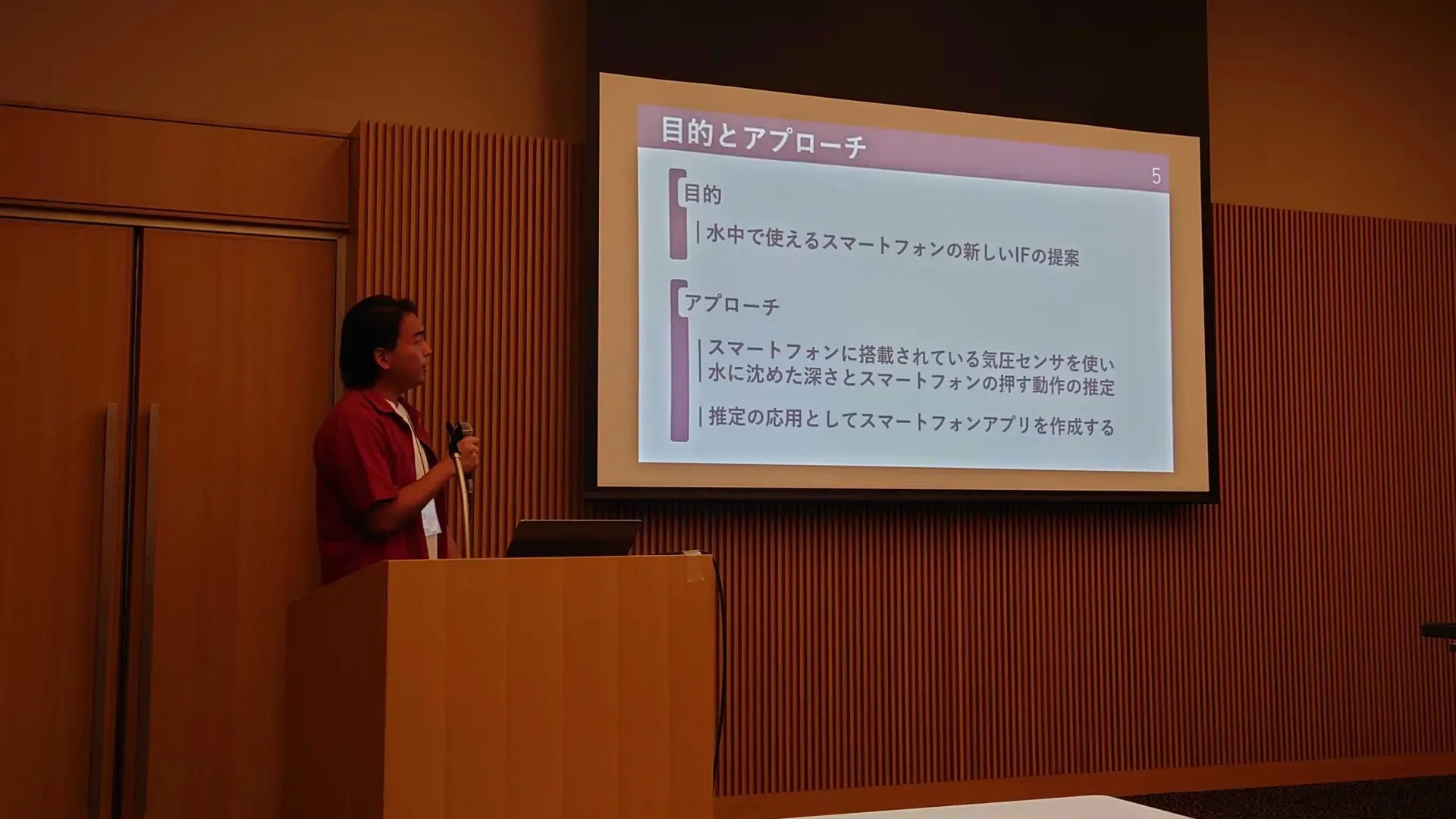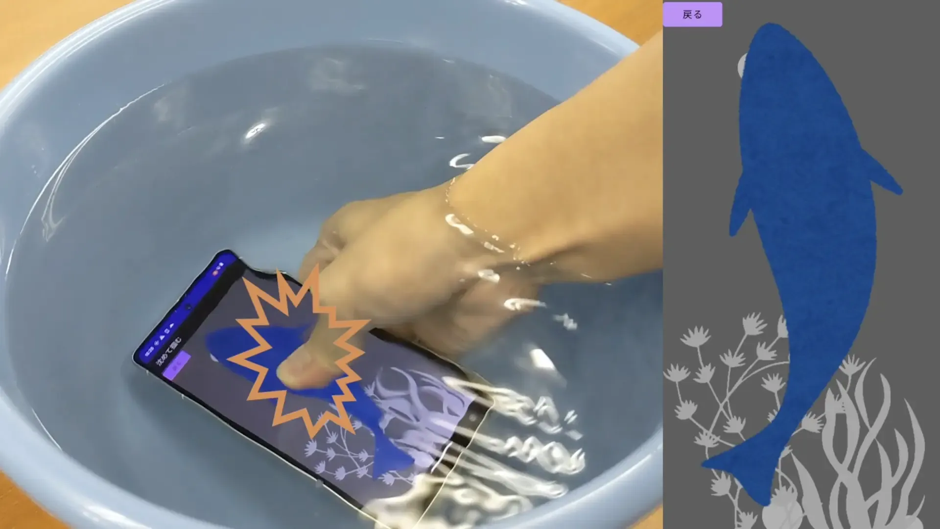 最近の携帯は防水性能が上がっていますが、我々には携帯を水に近づけてはいけないと言う考えがあります。 我々は携帯を水に沈めた時でも扱える入力インタフェースを提案します。 これにより、水中では扱えない画面を押す動作を水中でもできるようになります。 その応用例として、携帯を水に沈めて遊ぶ魚の掴み取りアプリを作成しました。