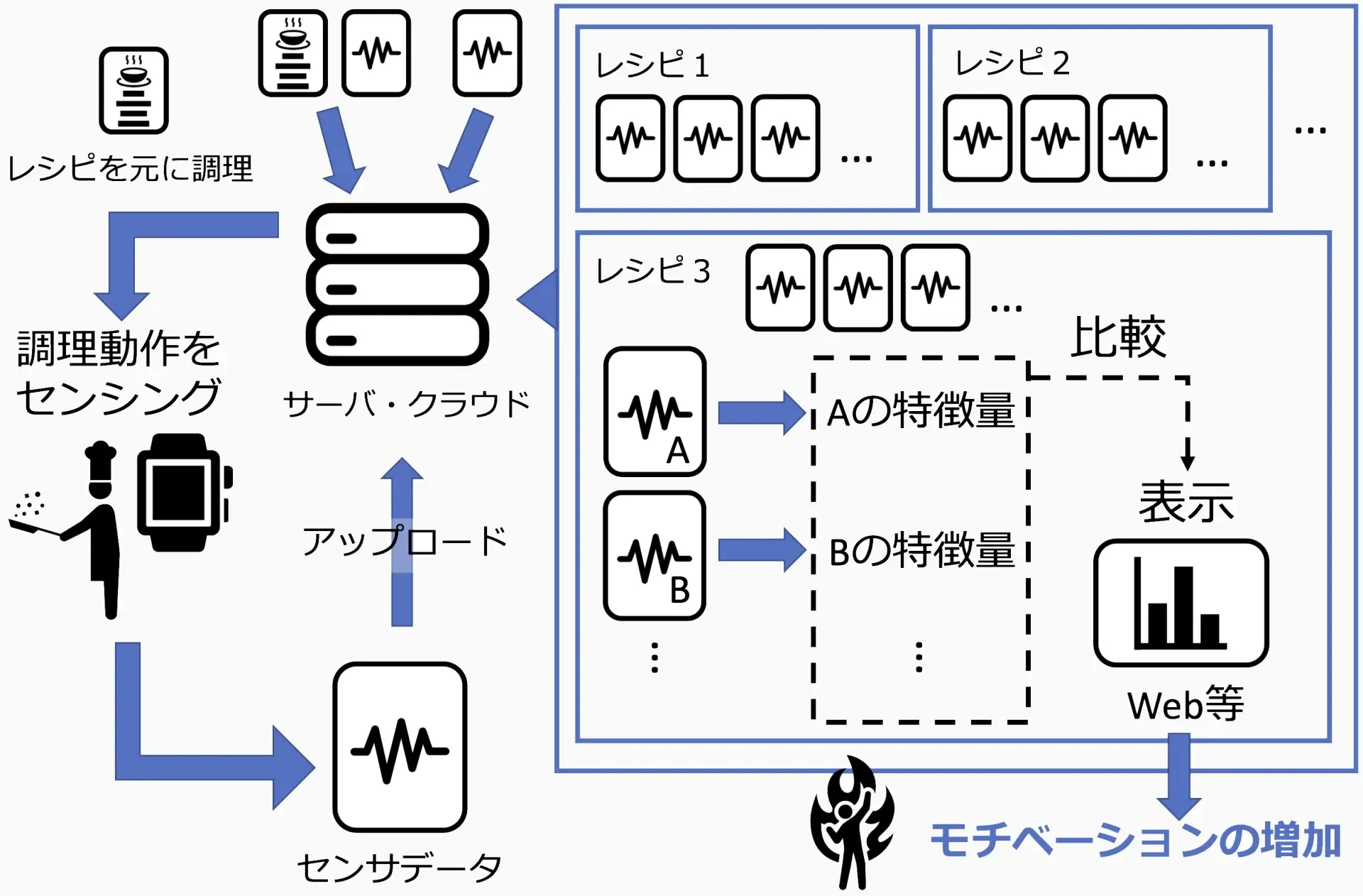 料理のレシピを共有する方法にはさまざまな種類があり世の中に浸透している.またレシピを利用して作成したものを報告する機能がある.しかし過去の自分や他者と調理能力や効率について比較できる仕組みがない状態である.そこで本研究ではレシピと調理動作を共有・比較し調理に対する楽しさの増加を目的とする.アプローチとしてウェアラブルセンサを使い調理作業のセンシングを行い比較するための特徴量を抽出する.研究の全体像を4つの項目「調理動作のセンシング」「調理能力と効率の分析」「分析結果の共有」「履歴や他者との比較を可視化」に分けてられる.調理動作の分析・比較を「各場所での分析と比較」と「場所移動の分析と比較」に分けて説明している.各場所での分析と比較では切る工程を例にして実際にどのような結果が得られるのかを調べた.場所移動の分析と比較ではハンバーグ調理の工程を例にして実際にどのような特徴が見られるのかを調べた.