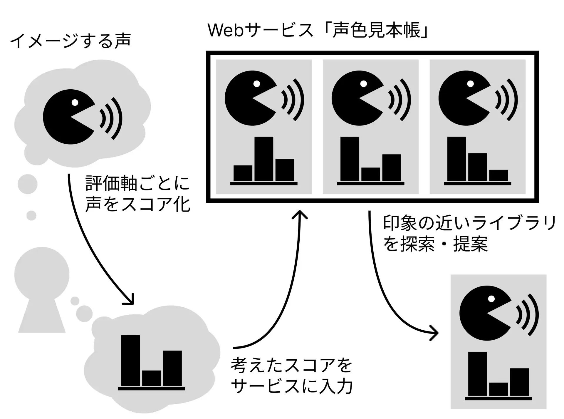 合成音声ライブラリは非常に数多く存在し,ユーザが求める声質のライブラリの探索には多大な手間と時間がかかる.そこで本研究では声質評価スコアを用いてライブラリを探索できるWebサービス「声色見本帳」を開発した.ユーザは求める声を「性別感」など7つの軸ごとに評価スコアとして数値化しWebサービスに入力すると,求める声に近しいライブラリを探索できる.探索時には独自に構築した機械学習モデルを用いてライブラリごとの評価スコアを事前に推定し付与したものを用いる.本研究は合成音声の選択を効率化し,多様なライブラリの活用促進に貢献する