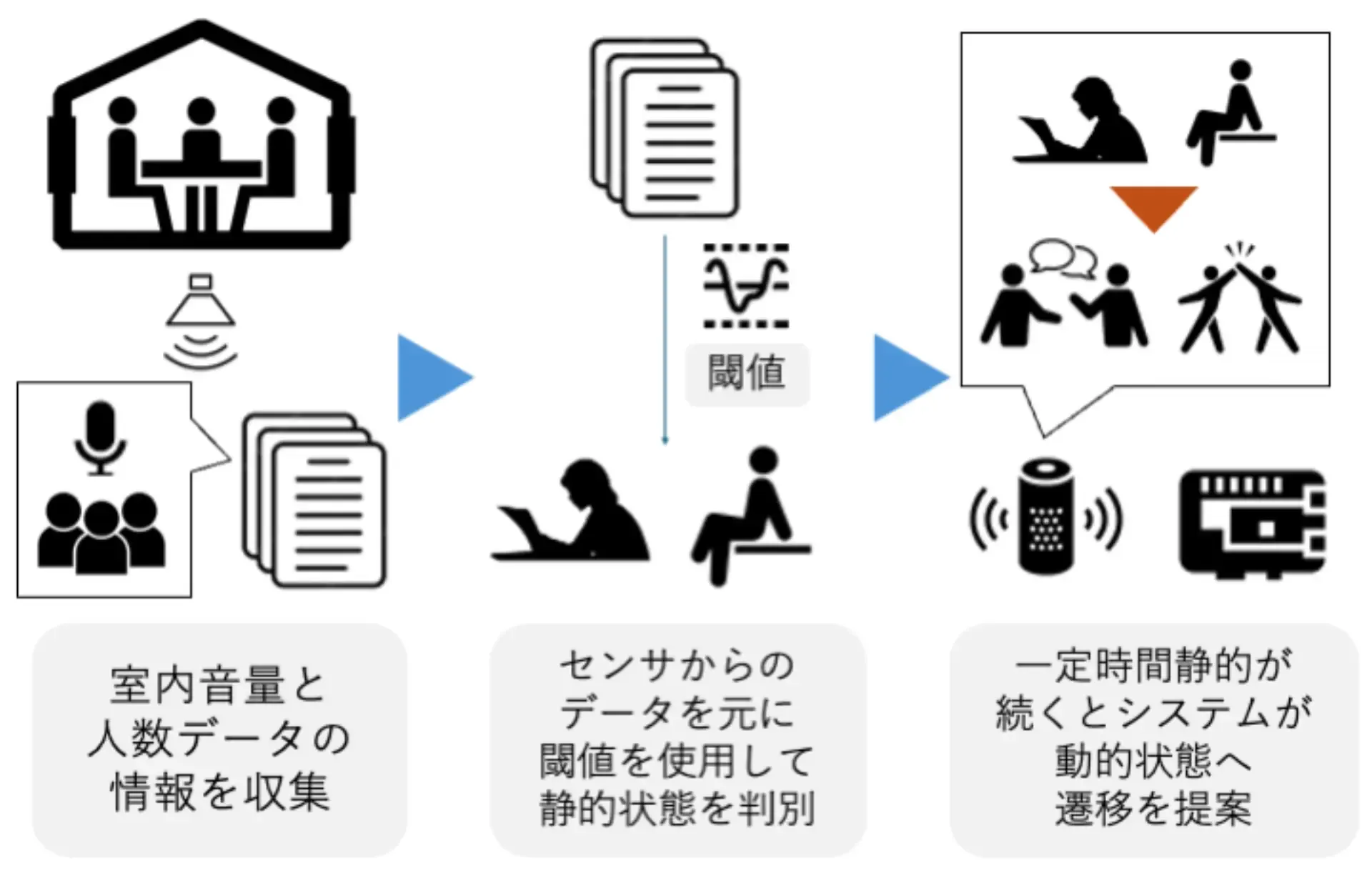 室内環境は人々の生産性や健康,コミュニケーションに大きな影響を与えるとされている.本研究では,小規模なコミュニティを対象に室内環境の状態をリアルタイムに検知し,適切な状態への切り替えを支援するシステムを構築する.静的環境に比べて動的環境は短時間のインタラクションを通じてリフレッシュ効果を提供しやすく,コミュニティ全体の交流や協働を活性化する点で重要である.これにより,個人の生産性向上のみならず,集団全体の創造性やコミュニケーションの質を高める効果が期待できる.
