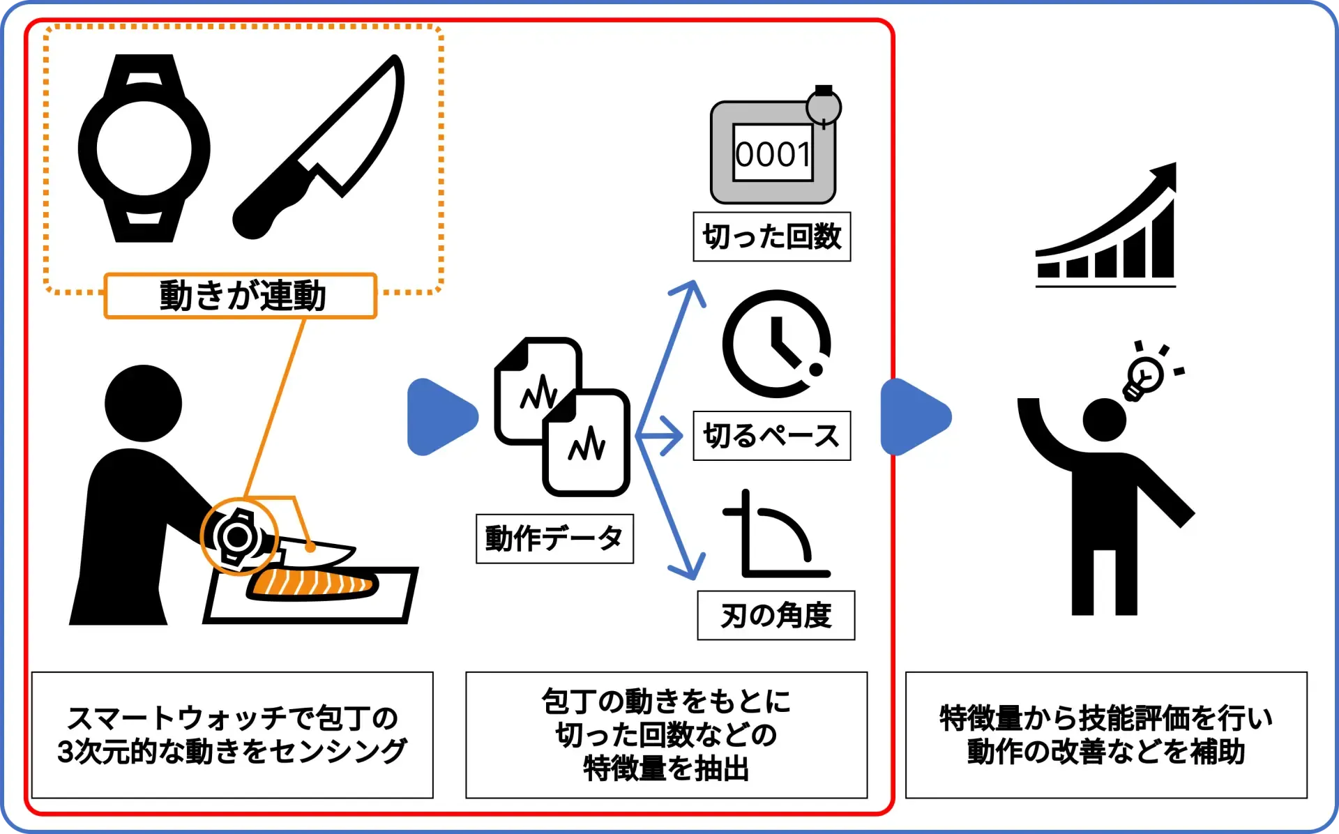 近年スポーツや医療の分野でウェアラブルデバイスを用いた技能評価が行われている. しかし,調理のような日常生活における技能評価を行なっているものはまだ少ない. そこで本研究では包丁を持った手の3次元的な動きをセンシングしたデータを用いて算出し,特徴量抽出を目的とする. アプローチとしてスマートウォッチの加速度・角速度のデータから手首の3次元的な移動を捉えるシステムを作成した. 実験として複数人の刺身を切る動作を取得し切った回数・切るペース・刃の角度の特徴量抽出を行った. 結果より,切った回数から刺身の厚さ,切るペースから手際の良さ,刃の角度から平造りなどの切り方の評価に使用できると知見を得た.